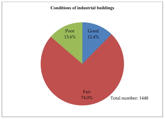 Factors in this group are mainly relating to the physical characteristics of a building, such as building age, current usage, architectural, structural and material conditions, condition of external fabric and finishes, and project timeline. The physical conditions of older buildings vary and the costs of reusing them will also differ. The assessment of a building’s physical condition is important and should involve a detailed survey of the building. The deteriorated structure and fabric of buildings may require high levels of maintenance and repair, which may result in high capital cost. In this case, adaptive reuse may not be a viable option [51]. In Hong Kong, most industrial buildings are relatively young and in fair structural condition, as shown in Figure 3 and Figure 4 [4]. Most industrial buildings are for mixed use. Adaptive reuse of these buildings should mostly meet the market needs and optimize the utilization of spaces. The project timeline is also important for the success of reuse because a long project timeline increases the risks for developers [52]. A detailed survey and assessment of existing buildings should be made in a timely manner, to avoid time overruns of adaptation projects. The government should consider providing relevant consulting services on the assessment of existing buildings to building owners who are interested in the adaptive reuse of buildings.