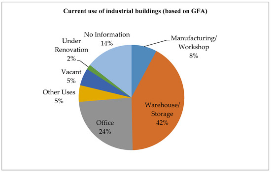 With the relocation of traditional manufacturing plants to Mainland China, most industrial buildings in Hong Kong has been converted for other uses [41]. At the end of 2014, the vacancy of private flatted factories in Hong Kong was 959,000 square meters, with a vacancy rate of 5.6%. Furthermore, there are a total of 1448 industrial buildings in Hong Kong, and around 67% are now situated in non-industrial zones, as shown in Figure 2 [4]. Most of the industrial buildings are in good or fair condition, and are mainly used as warehouses, storage, and offices, as shown in Figure 3, Figure 4 and Figure 5. These buildings also have large floor plans high ceilings, a strong floor loading capacity, wide corridors, and large lifts [41].