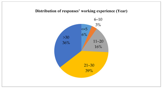 A questionnaire survey was carried out in September 2015. A five-point Likert scale was used for the survey, where “5” denotes extremely important, “4” important, “3” average, “2” less important, and “1” negligible. Respondents were invited to indicate the importance of each factor identified in Table 2. Respondents were also encouraged to add factors that were not included in the original questionnaire. The respondents were registered professionals in the Hong Kong construction industry, including architects, engineers, surveyors, project managers, planners, etc. Overall, 310 questionnaires were distributed and 62 replies were received. The response rate of the survey is 20 percent, which is considered acceptable compared with the normal survey response rate in the local industry [62]. Based on preliminary analysis and data screening, 61 replies were considered valid and used in the analysis. The distribution of respondents’ professions, work experience, and experience in adaptive reuse projects is shown in Figure 6, Figure 7 and Figure 8.