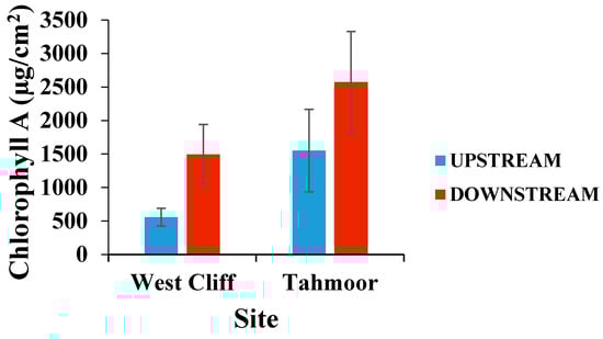 Figure 2 displays the mean chlorophyll-A densities on rocks collected from upstream and downstream of the mine water discharge points. At both sites, the density of chlorophyll on the rocks was not statistically significant (p > 0.05), however, it was observed that the chlorophyll abundance on the rocks was higher in the areas downstream of the mine discharge points. A statistical evaluation of chlorophyll-A revealed that there was a significant change in the chlorophyll-A density with the change in stream type (p = 0.028, F = 510.7, and df = 1, 1). Chlorophyll-A also showed a significant change with the change in site location (p = 0.026, F = 580.5, and df = 1, 1), which means that the change in the chlorophyll-A content in West Cliff was significantly different from the chlorophyll-A content of Tahmoor. The chlorophyll-A content in Waste Cliff was 558 µg/m2, while in Tahmoor it was 1551 µg/m2, indicating the environmental variability of the chlorophyll-A content even prior to the discharge point.
