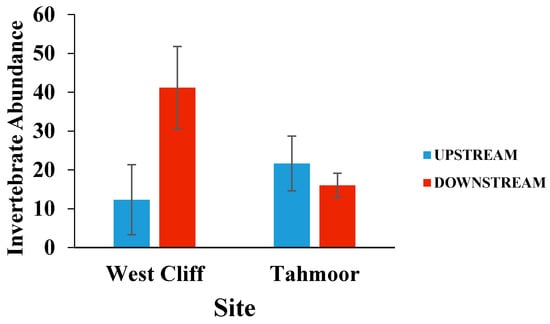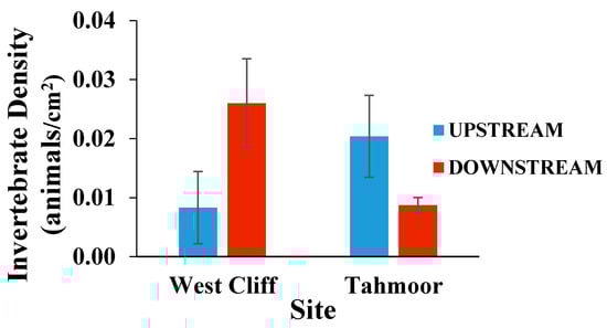 The density of the invertebrates, shown in Figure 4, was evaluated by the abundance per unit area of the rock, and the results contrasted with each other on both sites. Although the results were statistically insignificant, they showed an increment in the downstream of the West Cliff site. On the other hand, the downstream of the Tahmoor site had a lower invertebrate density compared to the upstream sampling site. A decrease in the density of the invertebrates in the Tahmoor downstream can be considered as indicative of halo-sensitive invertebrates in the area [28]. There was no significant difference in the density (abundance/rock size) at either site.