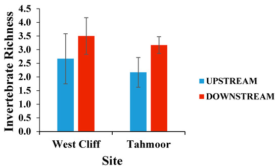 The invertebrate richness was not significantly different between the upstream and downstream locations in either of the rivers (p > 0.05), as presented in Figure 5, however, there was an apparent increase in richness in the downstream of both the West Cliff and Tahmoor sites, suggesting that the nutrient level is within the threshold limit of the contaminants for the survival of the species.