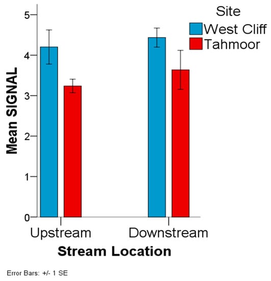 There was a statistically significant difference in the SIGNAL-2 scores between the West Cliff and Tahmoor sampling sites (F = 6.626, df = 1, 22, p = 0.017; Figure 6). West Cliff (M = 4.318, SD = 0.808) had a significantly higher mean tSIGNAL-2 score than the Tahmoor site (M = 3.438, SD = 0.868). Although the downstream locations displayed a higher mean SIGNAL-2 score (M = 4.036, SD = 0.979), than the upstream locations (M = 3.72, SD = 0.903) for both of the sampling sites, there was no statistically significant difference in the mean SIGNAL-2 score between the upstream and downstream locations (F = 0.675, df = 1, 22, p = 0.420; Figure 6).