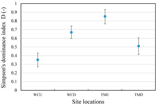 Simpson’s dominance index by site and stream location. WCU—West Cliff upstream; WCD—West Cliff downstream; TMU—Tahmoor upstream; TMD—Tahmoor downstream.