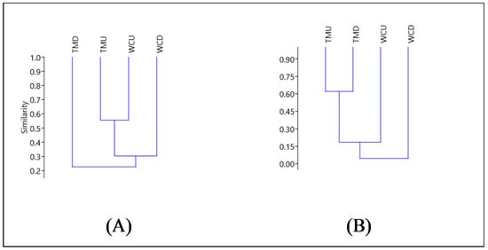 Jaccard’s similarity index (A), Cophenetic correlation coefficient = 0.9839; and Bray-Curtis dissimilarity index (B), Cophenetic correlation coefficient = 0.9894.