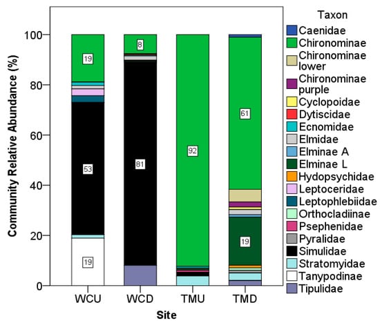 Relative abundance of invertebrate communities. WCU—West Cliff upstream; WCD—West Cliff downstream; TMU—Tahmoor upstream; TMD—Tahmoor downstream.