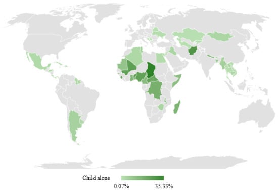 Parental education may also influence parents’ perception of their children’s ability to supervise or care for themselves and parents’ awareness of risks and available resources. Maternal education seemed protective for children being home alone in SA, EAP, and LAC, and specific countries within other regions (e.g., Malawi, Tunisia, and Bosnia and Herzegovina), and protective for children under the supervision of another child in almost all the countries studied. In some cases, this may be explained by increased access to alternative childcare such as daycare centers and/or private sitters, since women with higher levels of education may hold employment with a better salary and working conditions. In contrast, evidence showed that higher parental education is associated to a higher likelihood of (older) children being home alone in the U.S. [,], yet this association does not hold for all age groups [,]. In relation to our study, results from Madagascar, Montenegro, Iraq, and Jordan point in this direction. We are uncertain, however, of the mechanisms that explain this association in these countries, particularly because these countries do not share national characteristics that could be advanced as alternative explanations of why children are more likely to be home alone when their mothers have more formal education.