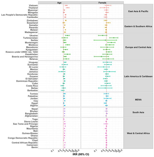 Figure 4 and Table S7a show the IRR of each country’s model for the same predictors but estimating their association with the outcome of child supervised by another child. Age was significantly associated in 41 countries, meaning that children aged three years or older were more likely to be supervised by another child younger than 10 years of age. All countries from EAP, ESA (except Swaziland), MENA, SA, and WCA (except Sao Tome and Principe), had an IRR larger than one, suggesting that older children were more likely to be supervised by another child compared to younger children. The same tendency was observed in some countries in ECA and LAC. More specifically for the former, Ukraine, Montenegro, Moldova, Kyrgyzstan, Kazakhstan, Bosnia and Herzegovina, and Belarus; and for the latter, Suriname, Mexico, Honduras, the Dominican Republic, and Cuba, were included. Overall, a positive association was found between age and child supervised by another child, and the IRR values ranged between 0.60 and 1.84.