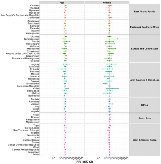 Figure 3 and Table S5 show the incidence rate ratios (IRR) and 95% confidence intervals (CI) of the number of days the child was home alone in relation to their age and sex. Age was significantly associated with child home alone in 34 countries, meaning children aged three years or older were more likely to be home alone. All countries from EAP (except Mongolia), ESA (except Swaziland), SA, and WCA, had an IRR larger than one, suggesting that older children were more likely to be home alone. Similar significant associations were observed in some ECA countries, namely Ukraine, Moldova, Kazakhstan, and Bosnia and Herzegovina. In LAC, the only countries with a significant IRR larger than one were the Dominican Republic, Honduras, and Uruguay. Finally, in MENA, the same association was observed only for Algeria and Iraq. Overall, a positive association was found between age and child home alone, and the IRR ranged between 0.7 and 2.7.