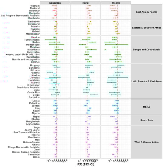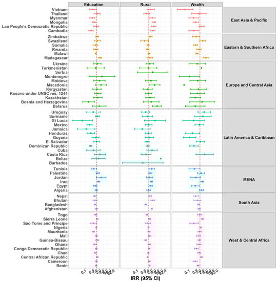 IRRs of predictors Education, Rurality, and Wealth for Children under Five Years under the Supervision of Another Child Aged 10 Years or Younger. Due to problems of convergence, the following countries were excluded from some analyses: Barbados and Saint Lucia, with the variables mother’s education, rurality, and wealth; and Cuba for the variable wealth. In addition, 95% CI for the estimates of wealth in Macedonia were too wide to be represented in the figure.