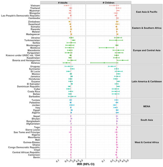 IRRs of predictors Adults and Children Living in the Household for Children under Five Years under the Supervision of Another Child Aged 10 Years or Younger. Due to problems of convergence, the following countries were excluded from some analyses: Barbados, with the variables number of adults, number of children, and number of girls living in the household; and Saint Lucia, with the variables number of children and number of girls living in the household.