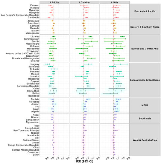 For the outcome child supervised by another child, a clear pattern showed that children in households with a higher number of adults were less likely to be supervised by another child, except for Swaziland, Afghanistan, Sierra Leone, and Ghana (Figure 8 and Table S7b). Unlike the results for children under five years home alone displayed in Figure 7, the pattern also showed that children in households with a higher number of children aged 10–14 were more likely to be supervised by another child, with a significant IRR in 43 countries. Finally, children from families with a higher number of girls were overall more likely to be supervised by another child, and this was consistent across the six regions. This positive association reached the level of significance for 30 countries.