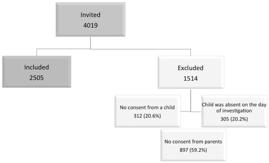 Two days before the study start, an informed consent form for schoolchildren and their parents was distributed. On the day of the study, children who agreed and possessed an informed consent form signed by their parents were invited to complete the questionnaire. They completed an anonymous questionnaire during one class under the supervision of an investigator, or an instructed school public health specialist or/and a teacher. After an initial introduction, schoolchildren able to read completed the questionnaires independently. Children in the 7–8 year age group and a few older children with learning difficulties were assisted. The flow diagram of the data collection is presented in Figure 1.