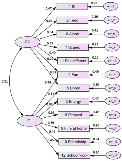 The dimensionality of the HRQoL scale was confirmed by the CFA. Based on the above EFA, we hypothesized that CFA would show two factors (latent variables). In addition, we postulated that these factors may be correlated, because each of them has a connection with a limited number of scale items (in contrast to EFA, factors are connected with all scale items). Figure 2 demonstrates a path diagram of CFA with standardized estimates (N = 1253), which was constructed on the basis of randomly selected sub-group 2 of the entire sample. All factor loadings (the path coefficients leading from the common factors to the observed variables) were found to be significant. It can also be seen that items ‘4 Fun’ and ‘5 Bored’ were associated with both positive and negative dimensions of the scale. The factors were moderately correlated (r = 0.509). Indices of good fit were assessed. A RMSEA score (0.055, 90% CI: 0.048–0.062) indicates a high model fit in the total sample, and other fit indices, namely TLI and CFI, also suggest sufficient model fit in the entire data set (Table 7).