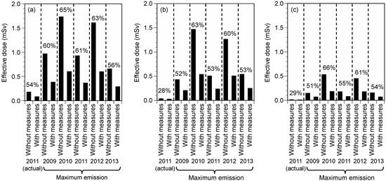 Figure 1. Effective doses for men (≥19 year) in the first year and the effectiveness of measures under different climate conditions without and with measures (Case 1): (a) Fukushima City, (b) Tokyo, and (c) Osaka. Percentages represent reduction ratios. Measures include restrictions on food distribution and evacuation.