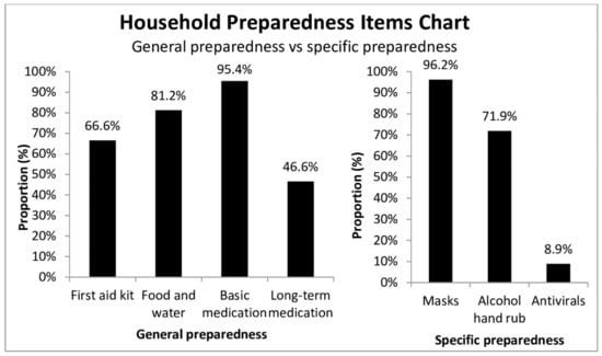A cut-off of five items was used because two of the items may not necessarily be applicable to all citizens. As antivirals for influenza (e.g., Tamiflu) are prescription medicines, it would be unrealistic to expect all citizens to obtain this []. In addition, only households with members suffering from chronic disease would be expected to possess long-term medication. Thus, a household could still be termed as having good preparedness if they did not possess antivirals and long-term medication but possessed the remaining five essential items. Three of these essential items were derived from CDC recommendations and were chosen to represent a category: First aid kit represented “safety supplies”, food and water was itself a separate category, while basic medication represented “health supplies” []. These items were also included in similar surveys of disaster preparedness in Hong Kong [,] so that the findings were comparable. The remaining two essential items were specific to infectious diseases: masks and alcohol hand rubs were included as “cleaning hands with alcohol-based hand rubs and putting on surgical masks” were advice given to the Hong Kong public by the government [].