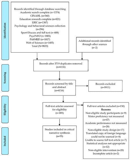The present systematic review builds on the reviews published by van der Fels et al. [] and Donnelly et al. [] by examining, in greater detail than previously reported, the underlying domains of motor proficiency (i.e., fine and gross motor skills) that may be associated with academic performance of school students. This review also expands on findings from reviews investigating the impact of classroom-based PA on learning outcomes by specifying motor skills as the type of PA being evaluated and academic performance in mathematics and reading as the learning outcomes of interest. Academic performance in mathematics and reading has specifically been chosen for this review due to the priority for students to develop foundational skills in numeracy and literacy upon entry to school. Therefore, the overall objective of this systematic review was to identify, critically appraise, and synthesize the findings of studies examining the relationship between motor proficiency and academic performance in mathematics and reading in typically developing school-aged children and adolescents. Two main aims were developed to address this objective: (1) to determine whether a relationship exists between motor proficiency and academic performance in mathematics and reading in typically developing school-aged children and adolescents; and (2) to determine whether motor proficiency-related interventions impact academic performance in mathematics and reading in typically developing school-aged children and adolescents.