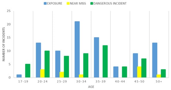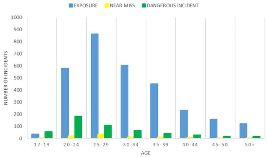 The distributions of the three types of incidents of interest in ARA and ARES personnel across age categories are displayed in Figure 1 and Figure 2, respectively. Exposures were most prevalent in the 25–29 years age bracket in the ARA, whereas dangerous incidents were more common in the 20–24 years age bracket. Exposures were more common in the 30–34 years age bracket in ARES, while dangerous incidents peaked in the 35–39 years age bracket.