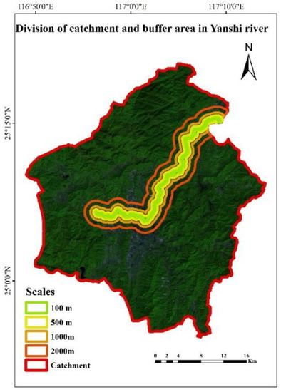 13]. The landscape indices were derived at three functional scales: watershed-wide, saturation-excess zone and riparian zone. In addition, the author mentioned that the vegetation index was the significant indicator of nitrate content in autumn. Oliverira et al. analyzed the linkage between landscape pattern and five selected water quality indices using different zones of analysis: riparian buffers and exclusive contribution areas. It is worth noting that a Land Cover Pollution Index (LCPI) was proposed in the study to replace the single land use types and study the relationship between landscape pattern and water quality [