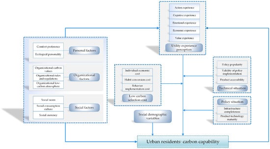 Based on the grounded theory, we showed that individual factors, organizational factors, social factors, utility experience perception, policy situation, low carbon selection cost, technical situation, and social demographic variables are the main factors that drive the carbon capability of urban residents. The individual factors mainly include the ecological personality and comfort preference. The organizational factors include organizational values, organizational system norms, and low carbon atmosphere. The social factors mainly include social consumption culture, social norms, and social currency. The policy situational factors mainly include the degree of policy popularization and the validity of policy implementation. The cost of low carbon selection mainly includes personal economic cost, habit transformation cost, and behavior implementation cost. The technological situational factors mainly include product technological maturity, product availability, and infrastructure completeness. The social demographic variables include individual statistical characteristics, family statistical characteristics, organizational statistical characteristics, and urban statistical characteristics.