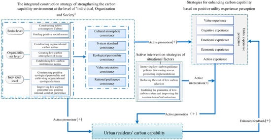 (1) The integrated construction of a strategy for increasing the carbon capability at the levels of the individual, organization, and society. At the social level, the government should build a positive consumer culture and guide positive social norms. At the organizational level, it is necessary to build the organizational carbon value, create a low-carbon attitude in organizations, and establish low-carbon system norms. At the individual level, the government should build a positive ecological personality and cultivate ecological citizens, as well as improving low-carbon security and guiding rational and comfortable preferences. In order to achieve consistent effects on the individual, organization, and society in the terms of the cultural atmosphere, institutional norms, ecological personality, value orientation, and rational preferences, we need to address the following issues. (1) Governmental aspects such as improving appropriate laws, regulations, and standards of environmental protection, establishing the concept of unified economic development and environmental protection, promoting balanced development, providing ecological education to all people, cultivating ecological citizens, improving the system for environmental information disclosure, enhancing the supervision system, and implementing “carbon-free” operations. (2) Actively encourage low-carbon behavior by enterprises, such as promoting a low-carbon management model, establishing low-carbon guidance system norms, maximizing environmental benefits, improving the technological level of low-carbon products and services, and reducing direct/indirect carbon emissions as much as possible while still satisfying the requirements in terms of comfort for residents. (3) Positively promoting a low-carbon lifestyle among the public, such as encouraging a green diet, green clothing, green living, green travel, and building a low-carbon community.