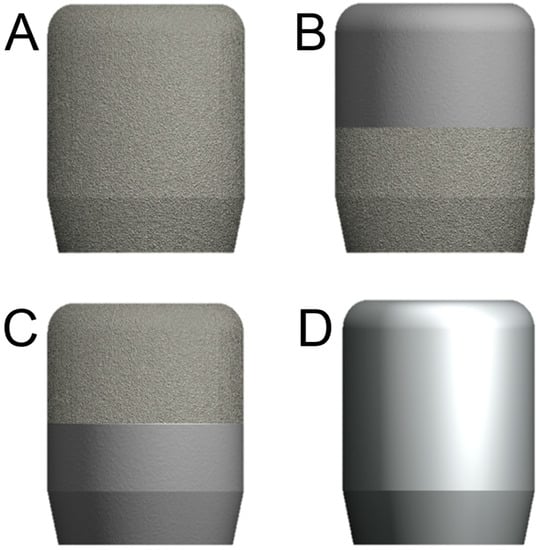 The same DMLS procedure was used to produce the HAs T1, which had a complete laser sintered surface. The HAs T2 and T3 had a machined portion without any porosity, in the upper half and in the lower half, respectively, because the laser parameters there were set to produce a dense surface, which was subsequently turned/machined; however, the T2 and T3 HAs had 50% of their surface (in the lower half and in the upper half, respectively) that was laser sintered and porous. Finally, the T4 HAs were fully machined.