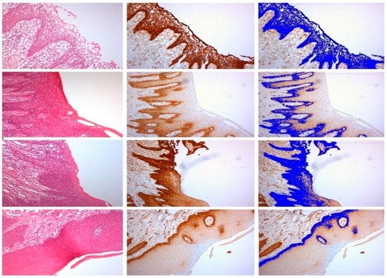After this healing period, before starting with the prosthetic restoration of the fixtures, the different HAs and circular sections of soft tissues around them were retrieved for analysis. The size of the gingival biopsies averaged 2.1 mm (5.5–3.8 mm) in thickness and 3 mm in height. All circular punches were made based on the amount of KT and the diameter of the healing abutments. Specifically, the diameter was 1.5 mm wider than the healing screw. A total of 50 samples were retrieved. These specimens were treated for immunohistochemistry. Three-micron sections were obtained with a Leitz 1512 microtome and stained with Hematoxylin–Eosin (H&E). The immunohistochemical staining of integrins α6 (rabbit polyclonal antibody, for human use, in paraffine sections) and CD20, CD3, CD68, and CD31 (specific markers of inflammation) was performed using the strep-ABC (Streptavidine–Biotine–Peroxidase) method (OriGene Technologies, Inc., Rockville, MD, USA). α6 was chosen to evaluate the amount of expression of the integrins as it represents the main component of hemidesmosomes. In this way, it would have been possible to know the expression of the molecule as an index of soft tissue bindings on HAs [