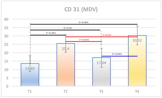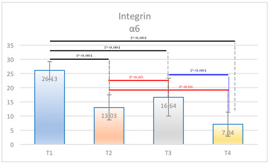 p < 0.001). With regard to integrins, statistically significant results emerged in the comparison between the T1 groups and all the other groups. The data were statistically analyzed and reported as mean values with standard deviation and standard error (