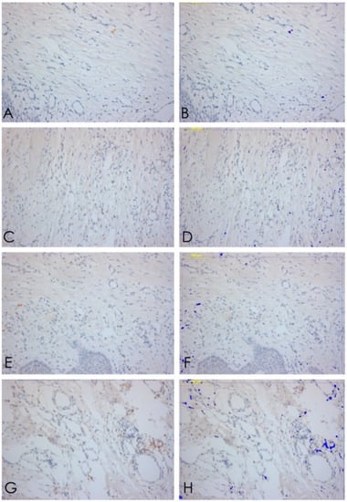. Sections were incubated with primary antibody for 30 min at room temperature. Slides were rinsed in buffer, and immunoreaction was completed with the Strep-ABC-Peroxidase method, applying the “super sensitive immunodetection” kit by BioGenex (San Ramon, CA, USA) and utilizing a multi-link as a secondary biotinylated antibody. After incubation with a chromogen employing “liquid DAB substrate pack” (BioGenex, San Ramon, CA, USA), the specimens were counterstained with Mayer’s hematoxyline and coverslipped. In each sample, five random fields at high magnification (20×) were chosen. The high magnification images were acquired using a dedicated software (QWIN