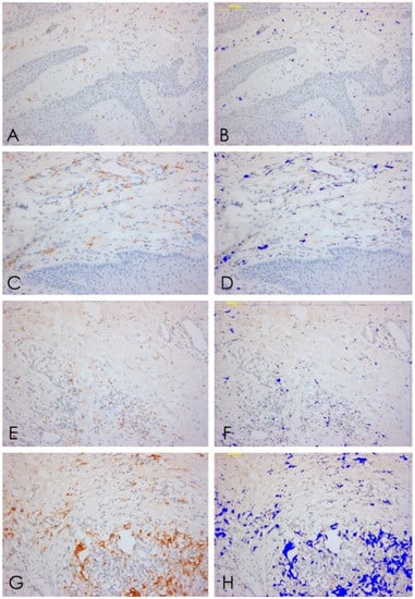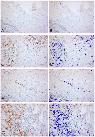 ®, Leica, Wetzlar, Germany) allowed us to identify a color gradation in the samples. This colorimetric scale was thus decisive in assigning a percentage of area of the sample under examination (automatically excluding the white areas of the slide). In this way, it was possible to calculate within the area of interest the percentage of positive area at the immunohistochemical stain.
