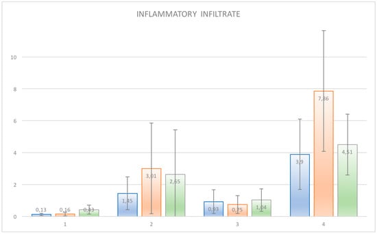 In the present study, the presence of an inflammatory infiltrate was found in all the samples under examination. Specifically, the inflammatory infiltrate consisted of lymphocytes, plasma cells, and macrophages. A higher value of T lymphocytes (CD3+) and B lymphocytes (CD20+) was observed in the specimens of the T4 group. A higher value of MDV (microvessel density) was also found in T4 compared with T1. This also agrees with the results reported by Artese et al. [