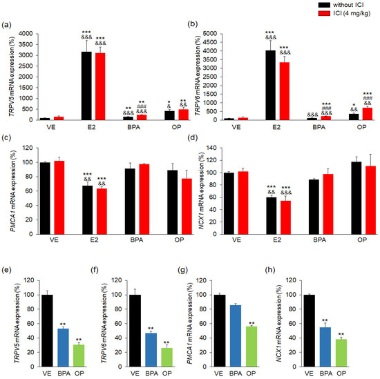 - Kim, S.; An, B.-S.; Yang, H.; Jeung, E.-B. Effects of octylphenol and bisphenol A on the expression of calcium transport genes in the mouse duodenum and kidney during pregnancy. Toxicology 2013, 303, 99–106. [Google Scholar] [CrossRef] [PubMed]