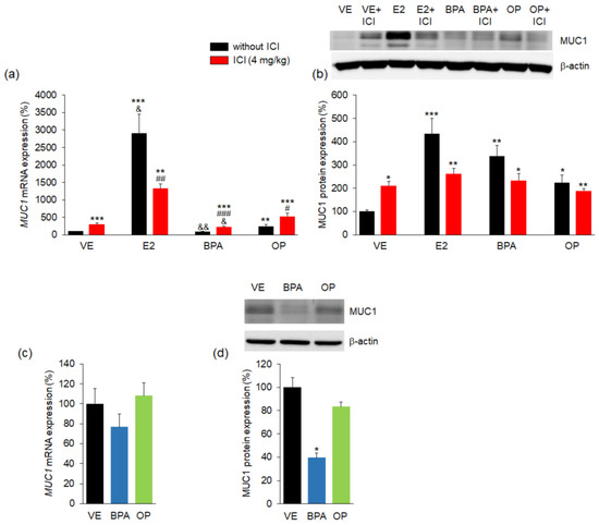 3.3. Effect of BPA and OP on MUC1 Expression in Maternal Uterus and Implantation Sites