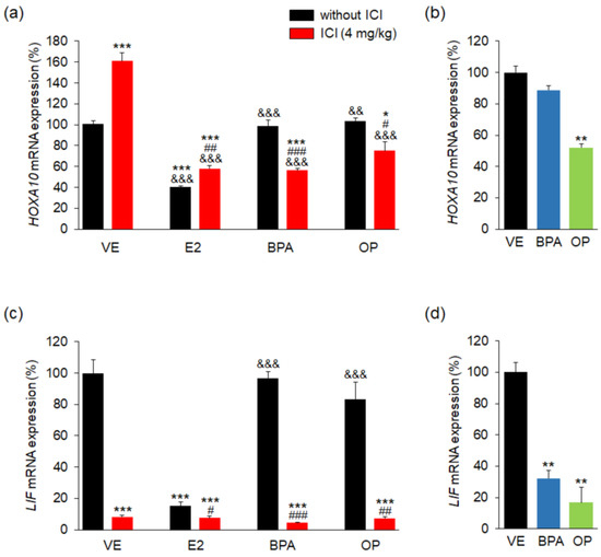 3.4. Effects of BPA and OP on HOXA-10 and LIF Expression in Maternal Uterus and Implantation Sites
