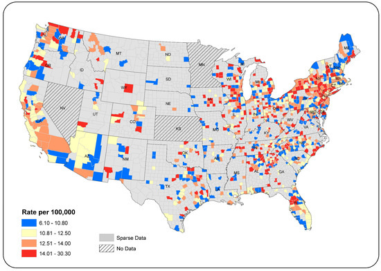 The county-level age-standardized ovarian cancer incidence rates (2009–2013) varied from 6.1 to 30.3 per 100,000 (Figure 1), a range considerably larger than that for the state-level data (i.e., 9.6–13.4 for the same time period as displayed in Figure 3). Incidence rates were classified using the quantile method [43]. Rates above the 50th percentile are shown in orange and red. Representation in counties in the West can be misleading because of the large geographic size of these counties. Areas with higher rates are located in Washington, Wisconsin, New York, and New Jersey, with additional foci of high rates in northeastern Alabama, western Florida, and coastal North Carolina.