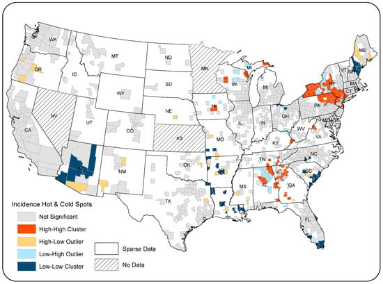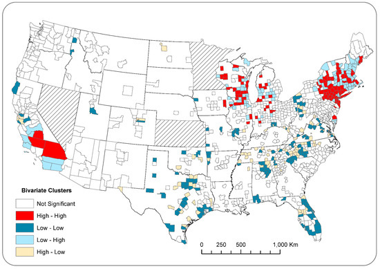 Results of bivariate LISA analysis indicate an overall significant spatial association between county-level ovarian cancer incidence and the count of paper plants in nearby counties (Moran’s I: 0.0127; p < 0.05). The bivariate LISA map (Figure 5) illustrates that 115 counties were labeled as “High–High” (in dark red), which represents clusters of counties that had high incidence rates while being surrounded by counties with high counts of paper mills. Likewise, 139 counties labelled as “Low–Low” (in dark blue) had significantly low incidence rates, whereas nearby counties had low paper mill counts. Clusters of “High–High” and “Low–Low” collectively indicate a positive spatial association between ovarian cancer incidence rates and paper mill counts.