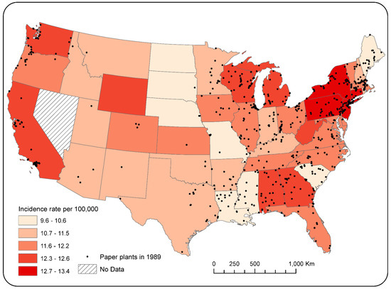Paper mill locations and state-level ovarian cancer incidence rates by state (2009–2013).