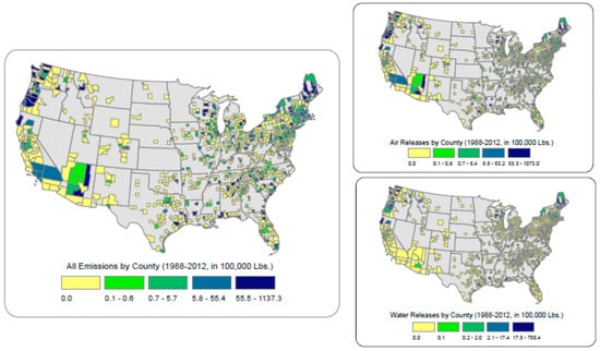 - Neumann, C.M. Improving the U.S. EPA Toxic Release Inventory database for environmental health research. J. Toxicol. Environ. Health B Crit. Rev. 1998, 1, 259–270. [Google Scholar] [CrossRef] [PubMed]