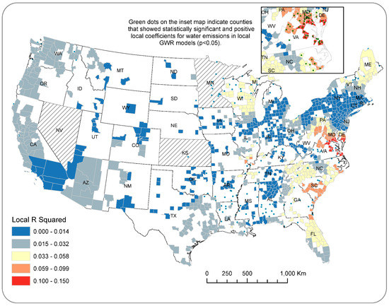 Results of local regression parameters from geographically weighted regression (GWR) models for All Emissions showing spatially varying explanatory power (i.e., local R squared values) for the county-level data.