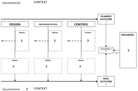Figure 1 because it aims at the identification of the mechanisms in an easy way, focusing on the possible differences between the planned outcome and the real outcome and taking in consideration the contextual factors, including drivers and barriers that can act at different phases of the OSH intervention, namely design, implementation, and control. As noticed by Masi and Cagno [