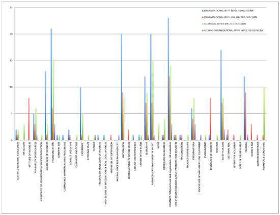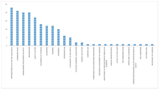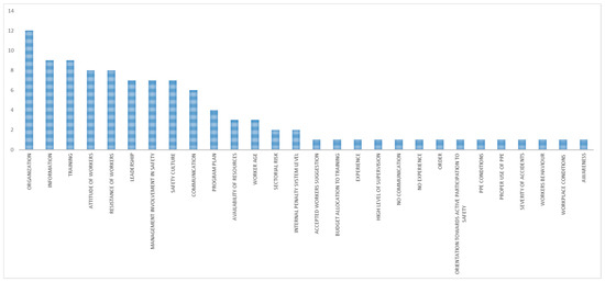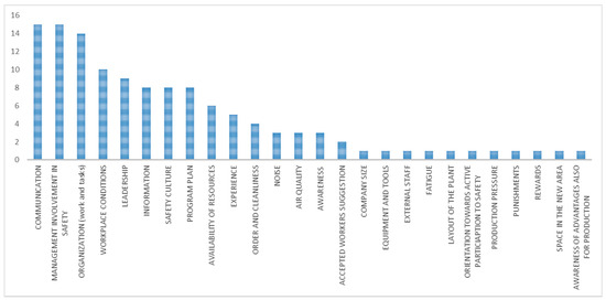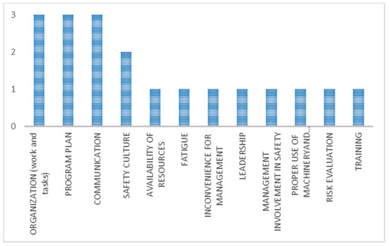 Figure 4) were work and tasks organization, information, training, attitudes of workers, resistance of workers, leadership, management involvement in safety, safety culture, and communication.