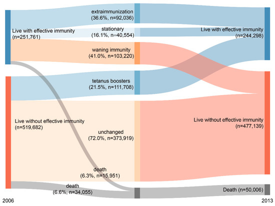 Figure 1 demonstrates the interval changes in immunity against tetanus for the entire study cohort before and after the 8-year follow up. At the beginning of the study, barely one-third of adults ha effective immunity against tetanus, the VC was 35.1% (245,016 participants had effective immunity vs. 526,427 participants who did not). After eight years, nearly half (41.0%, n = 111,708, 14.5% of entire cohort) of participants’ immunity waned whereas only a portion (21.5%, n = 103,220, 13.2% of entire cohort) of participants received tetanus boosters. Furthermore, quite a significant portion of participants (36.6%) were extra-immunized with excessive tetanus boosters. All the above changes led to an overall decline in VC of the entire cohort (Figure 1, Figure S1).