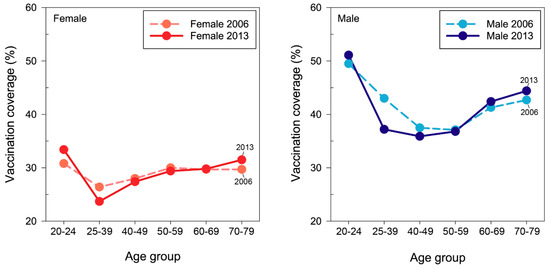 Tetanus vaccination coverage among adults aged between 20 and 79 years in Taiwan’s representative cohort at the beginning and the end of 8-year follow up by age and gender. (2006–2013, n = 771,443).