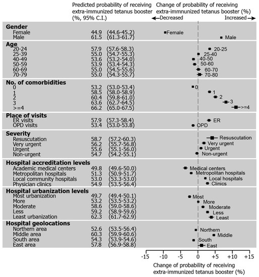 Predicted probability of receiving extra-immunized tetanus boosters and change from base probability by recipient demographics and visit characteristics among tetanus booster recipients aged between 20 and 79 years in Taiwan. (2006–2013; recipient number, 214,847; visit number, 303,480).
