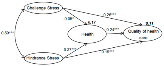 After comparing different effects of health, we noted significant indirect effects between challenge stress and the quality of health care (Sobel z = −9.241; p < 0.001) and between hindrance stress and the quality of health care (Sobel z = −8.756; p < 0.001), which were significantly mediated by health. It was also found that partial mediation of health was between challenge stress and the quality of health care (p < 0.001), as well as between hindrance stress and the quality of health care (p < 0.01).