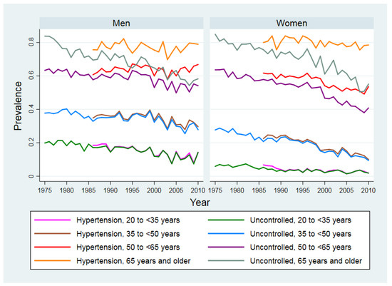 Our analysis revealed that the prevalence of hypertension declined for men and women except for men between 50 and less than 65. The steepest declines were seen in women of 35 and older. Additionally, the prevalence of hypertension was consistently lower in women than in men of the same age except for women in the age group of 65 and older. Possible explanations for the lower prevalence of hypertension in Japanese women are that they consume less alcohol than men and have a lower BMI than men of the same age [32]. Japan has been successful in managing obesity in women, but obesity prevalence in Japanese men is still increasing [5,32]. We found that the decline in the proportion of individuals with uncontrolled hypertension seemed to have resulted from successful control by medication. A previous report also concluded that control of hypertension by medication was the main reason for a decline of systolic blood pressure in all people, except in young women [5]. Furthermore, we found that birth cohorts of women born between 1920 and 1960 experienced a steeper decrease in the proportion of individuals with uncontrolled hypertension than men born in the same years.