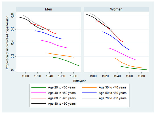 Figure 2 shows that the proportion of individuals with uncontrolled hypertension by birth year for birth cohorts declined for cohorts born in later years in both men and women of all age groups. The decline appears to be steeper for women than men for all age groups.