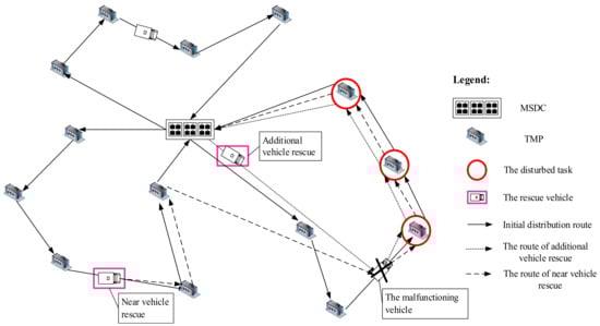 - The number of vehicles used in different disturbance recovery distribution schemes is discrepant. As shown in Table 6, there were different numbers of vehicles in the four distribution schemes. The original distribution vehicles continued to be used in the first two distribution schemes; vehicle 1 was dispatched to rescue disturbed vehicle 3 and was responsible for the remaining TMPs that had not been served in the delivery tasks of vehicles 1 and 3 (i.e., the red route in Figure 6a,b). Vehicle 4 was added in the latter two distribution schemes to assist vehicle 1 in completing the service to the remaining TMPs that had not been served in the delivery tasks of vehicles 1 and 3 (i.e., the red route belongs to vehicle 1 and the purple route belongs to vehicle 4 in Figure 6c,d).