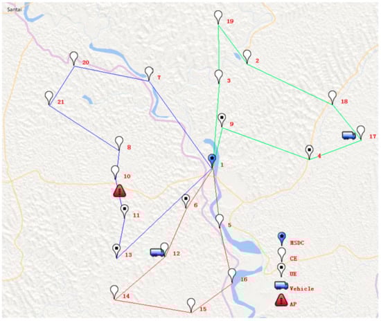 | Collection of points, , where represents the TMPs that have not been served; is the location of the disturbed vehicle; represents the location of the vehicles on the way to deliver cargoes when a disturbance event occurs, that is, the pseudo distribution centers; is the location of the MSDC, which is the initial distribution center | |
