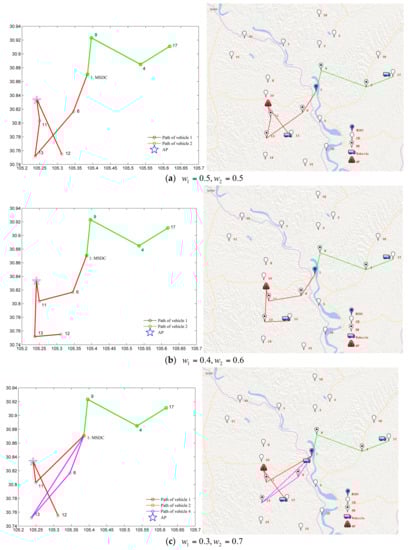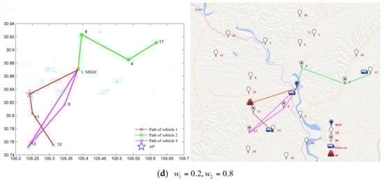 - The different weight coefficient settings of objective functions resulted in the same fitness value. From the results in Table 6, we found that the same value of could be obtained from different values of by calculations using Formula (14). This means that the different weight coefficient settings of the objective functions have no influence on the fitness value of the optimal solution, but different values of cost and time disturbance subobjective functions are formed; in addition, different disturbance recovery schemes are obtained at the same time. Therefore, in the face of actual disturbance events, emergency rescue decision makers should set the appropriate weight combination of objective function according to the current disturbance situation.